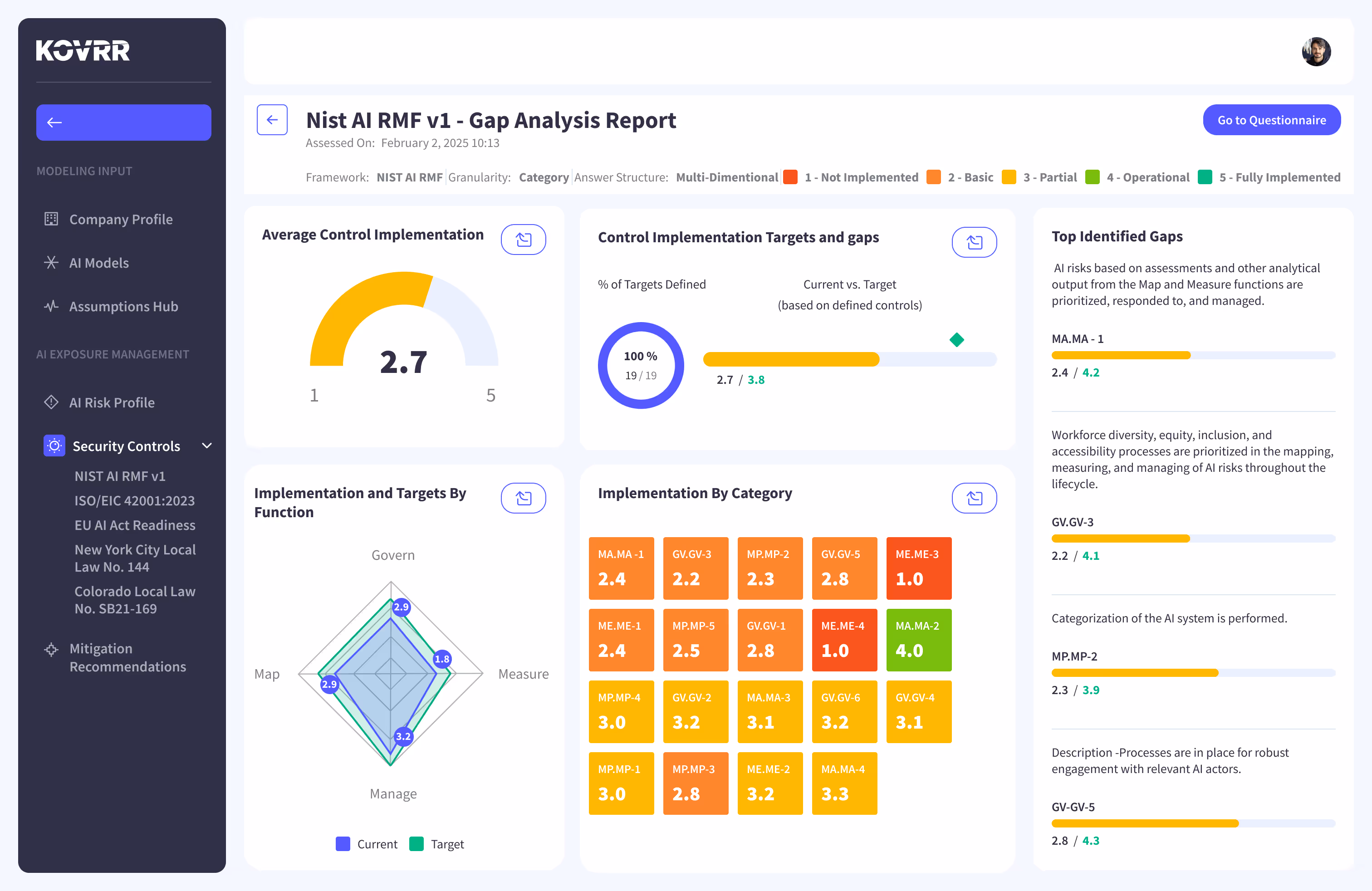 Kovrr’s AI Risk Assessment helps you evaluate safeguard maturity at scale. Benchmark against leading frameworks and ensure your organization stays aligned with evolving oversight expectations.