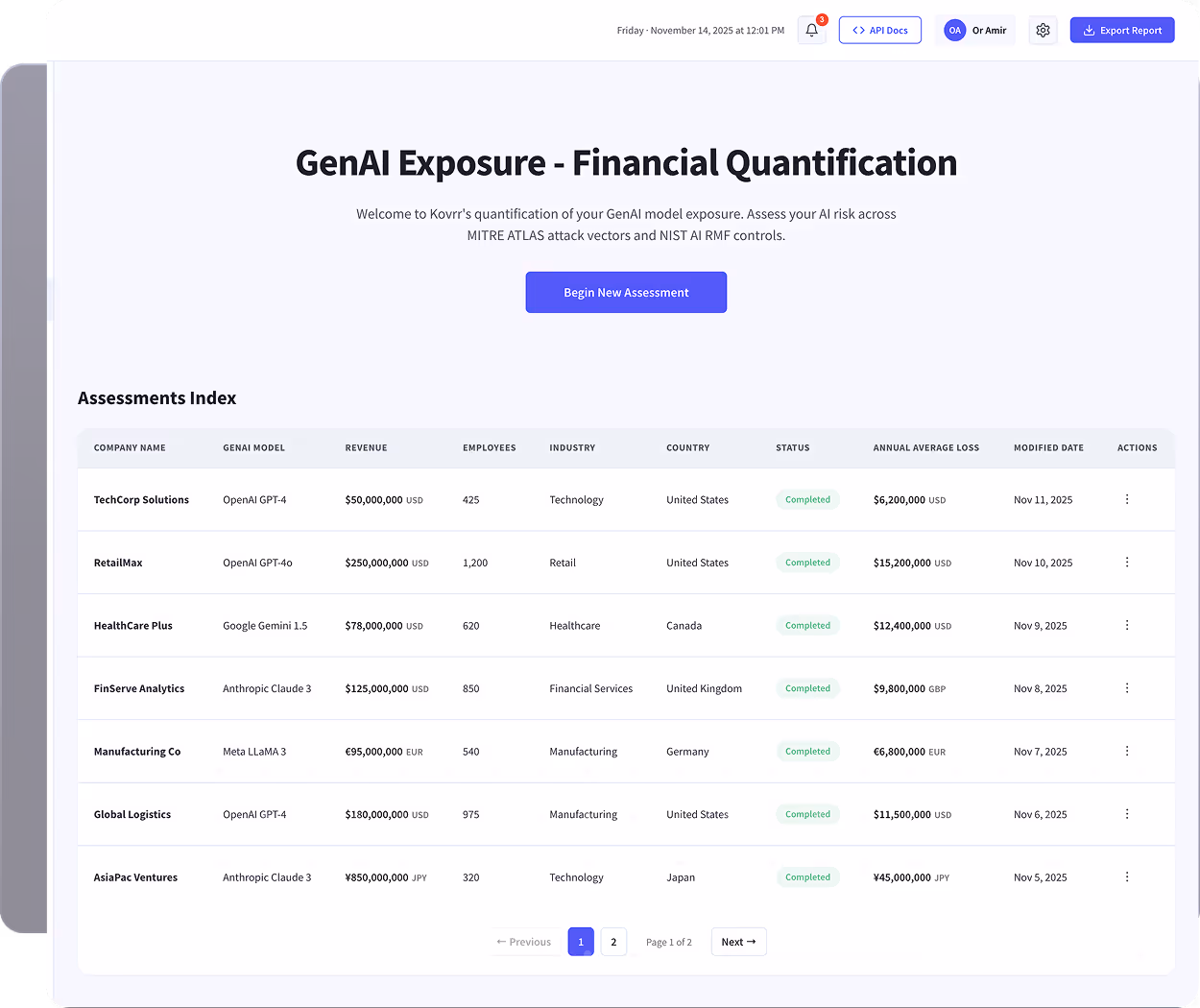 Kovrr’s results help GRC and risk teams translate technical GenAI exposure into actionable business insight. Reports quantify potential losses, show financial and operational impact, and compare event types, access vectors, and probability ranges. This structure enables data-backed trade-offs, clearer prioritization, and stronger alignment between AI risk management and enterprise risk appetite.