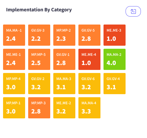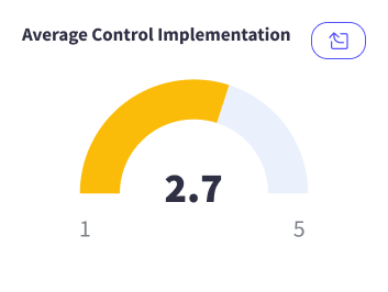 The average implementation score is a gauge, providing a single-number snapshot of an organization's overall cybersecurity or AI maturity based on the average of all current control scores. While high-level, this metric is useful for establishing a baseline at the beginning of an assessment initiative, allowing leaders to more easily communicate with executives and board members and serving as a competitive marker in future evaluations.