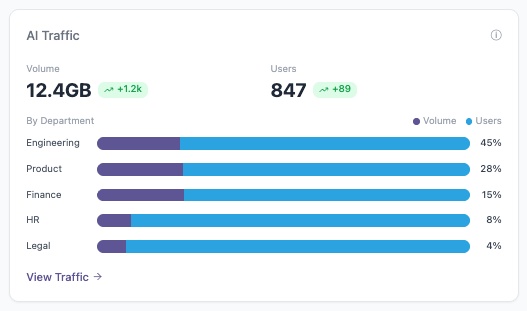 The AI Traffic view reflects how AI usage is distributed across the organization and how that usage changes over time. Volume represents the amount of AI-driven activity, such as interactions or data processed across systems. User counts indicate how broadly AI tools are being used across all teams. Taken together, these signals help AI GRC leaders understand both the intensity and spread of adoption, as well as where growing reliance may call for closer oversight.