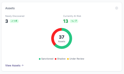 The Assets breakdown illuminates the number of individual AI assets and their governance status within the organization. It reflects assets that have been newly identified, those currently flagged as at risk, and how they are categorized based on approval status. Assets are labeled as sanctioned, shadow, or under review, giving AI GRC professionals insight into which AI components are formally governed and which require additional assessment as oversight matures.