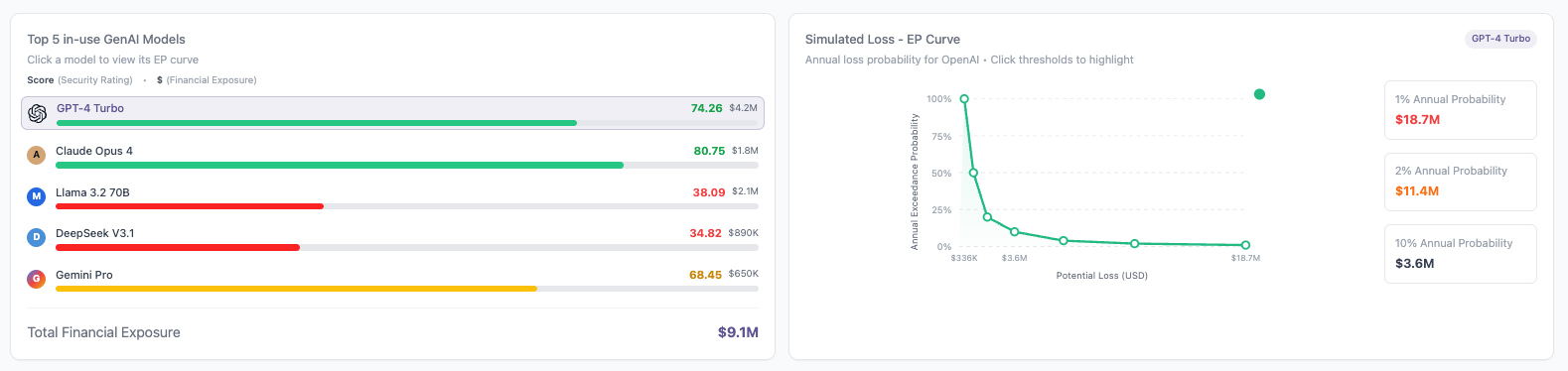 The Top 5 In-Use GenAI Models chart highlights the modeled average financial exposure associated with the most actively used models, providing a baseline view of the expected loss tied to routine usage. The associated simulated loss exceedance probability curve adds depth by showing how losses are distributed across different likelihood thresholds. It illustrates the probability of exceeding specific loss amounts, including low-frequency, high-impact outcomes. These perspectives combined help leaders understand financial exposure well enough to plan and prioritize effectively.