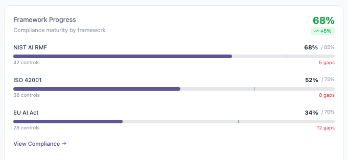 The Framework Progress panel reflects governance maturity across established AI frameworks, including NIST AI RMF, ISO 42001, and the EU AI Act. This information is drawn directly from the AI Compliance Readiness module and reflects only the assessments the organization has initiated. Each percentage represents current maturity relative to the defined target state for that framework. In some cases, the target may be less than fully mature, depending on applicability and risk tolerance. Remaining gaps are surfaced alongside progress, providing a clear view of how current performance aligns with intended governance objectives.