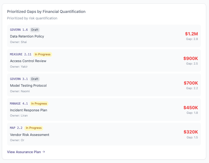 - Governance gaps from the AI Assurance Plan are ranked by financial impact to guide focused remediation.