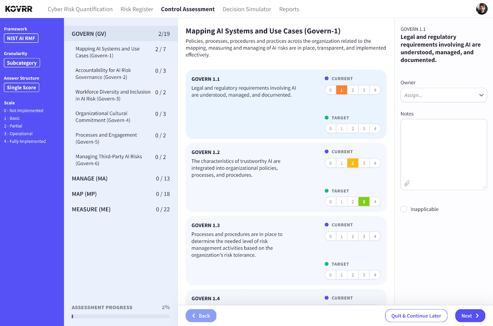 Even more beneficial is to pair these present control levels with a defined target state that reflects the organization's risk appetite and regulatory obligations. The best AI risk assessments will offer a means for GRC teams to easily identify these gaps, set priorities regarding which areas they should invest in, and track progress over time. Taken together, this information can be transformed into an action plan that improves resilience and ensures AI use remains aligned with business objectives.