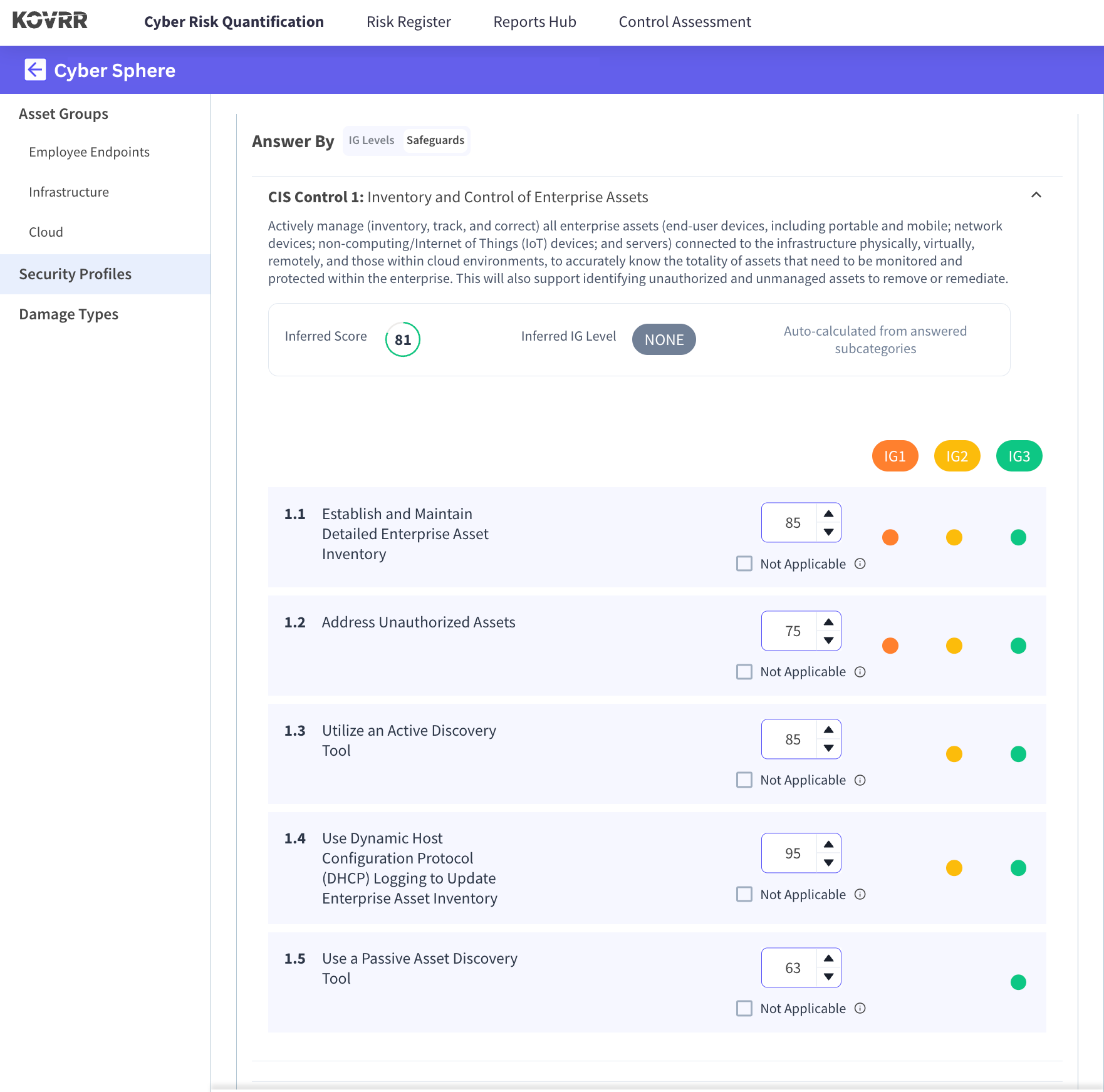 A&F partnered with Kovrr to optimize cyber risk quantification in a structured and iterative manner. The initiative, spearheaded by a Sr. Manager of Information Security and an Information Risk Analyst, began with the creation of A&F's customized Cyber Sphere within the Kovrr CRQ platform. They mapped their existing safeguards according to the CIS Controls v8 framework, specifying the sub-control maturity levels to reflect their current security posture. This process established an initial quantified baseline to support further analysis.